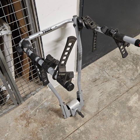 Thule cykelholder til 2 cykler, fremstillet i aluminium med sølvfarve. Designet til montering på bilens anhængertræk. Passer til forskellige cykeltyper og sikrer stabil transport.