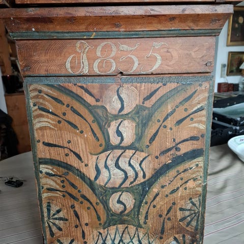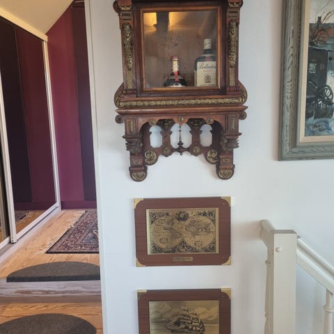 Meget flot og velholdt Københavnerskab. Original, har ikke andre mage til, men andre tilsvarende. Hvidt kabinet, flotte brune skydelåger. Glasskufferne er intakte. Mål ca: H: 91 cm. D, nederst: 28 cm, D,øverst:40 cm, B: 90,5 cm.
