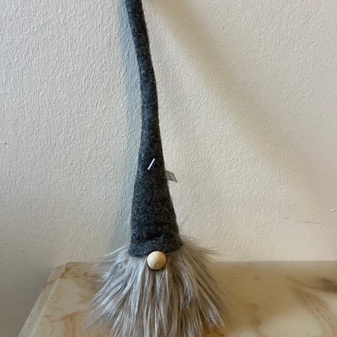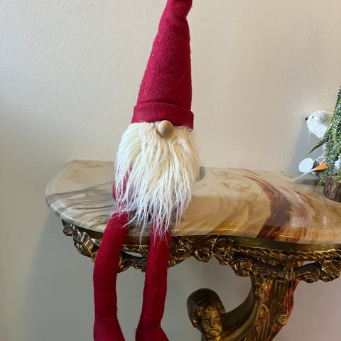 Siddende rød filtjulemand, med ståltråd i huen, så den kan bøjes som du ønsker. Fra La Vida. Fra nu lukket butik. Faktura haves.