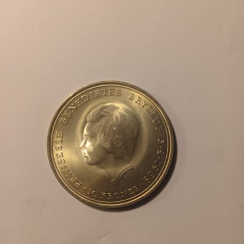 Dansk 10-kroners sølvmønt fra 1967, der blev udgivet i anledning af prinsesse Margrethes og prins Henriks bryllup.