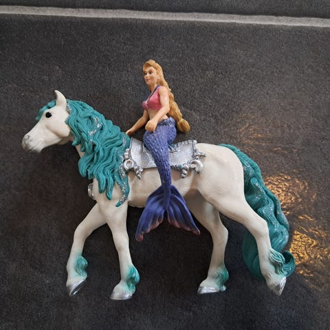Western Rytter Figur Legetøj med en højde på ca. 12 cm. Figuren forestiller en rytter iført rød skjorte og cowboyhat, siddende på en brun hest med sort man og hale. Fremstillet i plastmateriale. Velegnet som samlerobjekt eller legetøj.