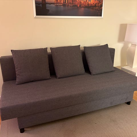 Praktisk sovesofa fra IKEA fra ikkeryger hjem. Nem at slå ud, måler 140x188 cm når den er foldet ud. Alle betræk kan tages af og vaskes. Opbevaringsboks til dyne mm. der passer under sofaen medfølger.