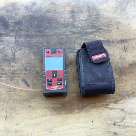 Hilti PM 2-L Laseropmåler i rød farve med plastmateriale. Leveres med opbevaringskasse og tilbehør. Velegnet til præcise opmålinger i bygge- og installationsarbejde.