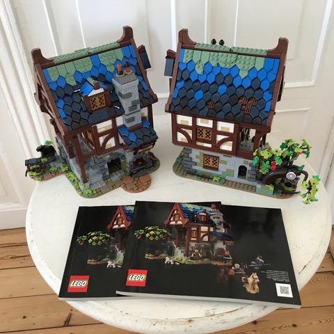 LEGO Medieval Blacksmith byggelegetøj med detaljeret smedjehus, minifigurer og tilbehør. Inkluderer et hus med blå tag, skorsten, trævogn og forskellige redskaber. Velegnet til børn og samlere, der interesserer sig for middelaldertemaer.