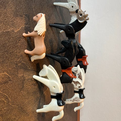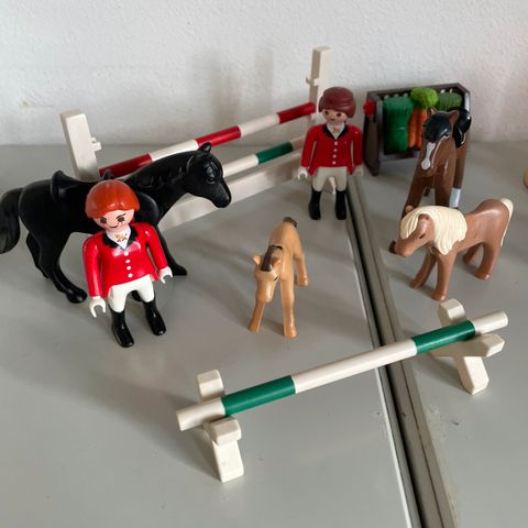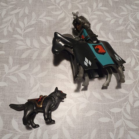 Sort hest med bevægeligt hoved og sadel. Rytter med hjelm og spand.
