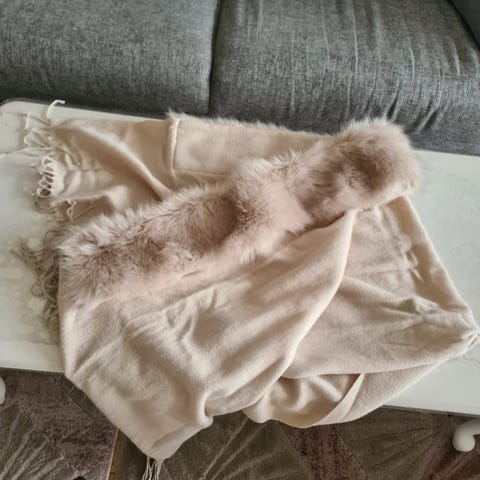 Smukt og varmt tørklæde fra Buch, i blød uld med elegante strudsefjer langs kanten.