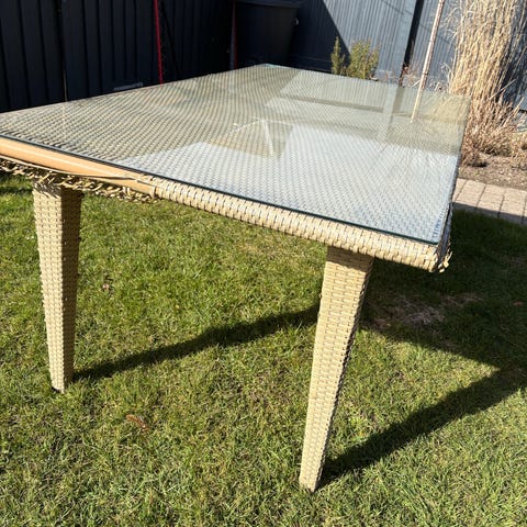 Bord med glasplade og ben i rattanflet. Hxbxl 73x110x180.