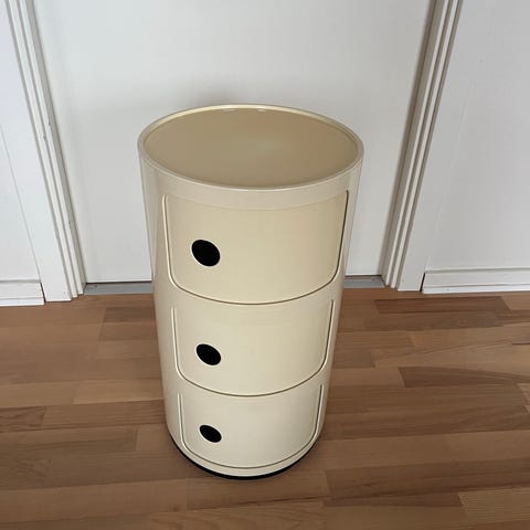 Rundt Kartell Componibili kommode med 3 rum til opbevaring. Bordet har lettere brugstegn og fremstår let “gulnet”. Deraf prisen. Trænger til en rengøring
