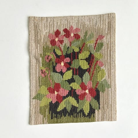 To fine broderier med rødkælk og røde tulipaner indrammet i røde rammer. Sælges samlet