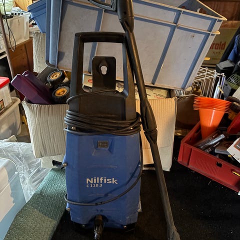 Nilfisk C 110.7-5 X-TRA højtryksrenser i blå farve. Inkluderer spulepistol, lanse og tilbehør med tilslutningskabler. Velegnet til rengøring af udendørs overflader og køretøjer. Fliserender og ekstra lanse medfølger