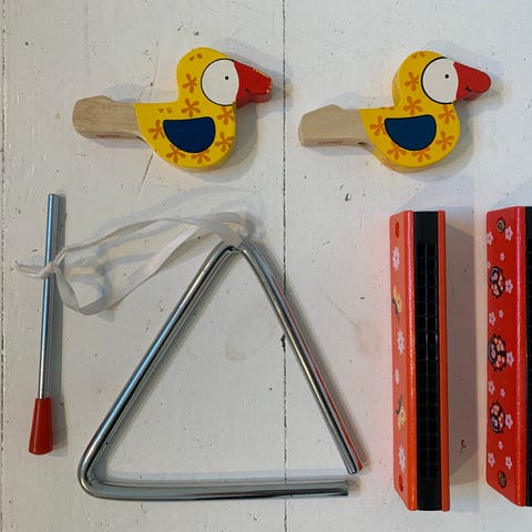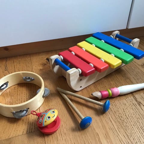 - Indeholder: 1 xylofon, 1 tamburin, 1 trommestik, 2 maracaer, 1 fløjte