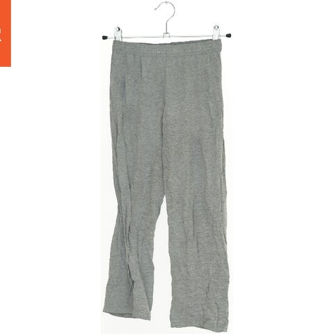 Dette er et par grå børnebukser med elastisk talje og manchetter ved anklerne i lyserød farve. Bukserne har et mønster med tegninger af elefanter samt forskellige farverige geometriske former og mønstre som stjerner, trekanter og cirkler.