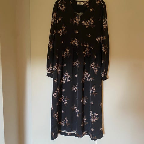 Noa Noa Hverdagskjole i sort med blomsterprint. Kjolen er størrelse 42 og designet til kvinder. Materialet er ikke specificeret, men kjolen har et mønstret design med små blomster i gule og blå nuancer.