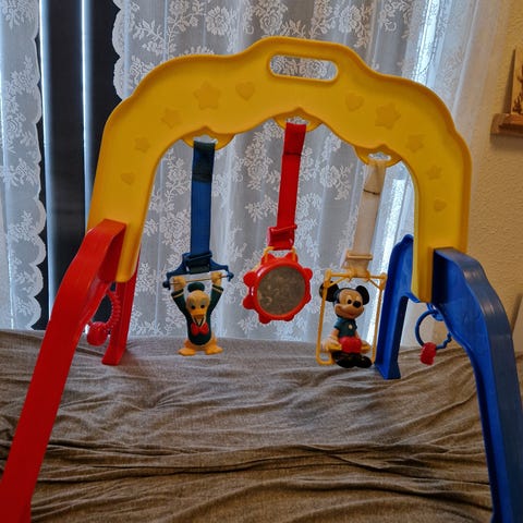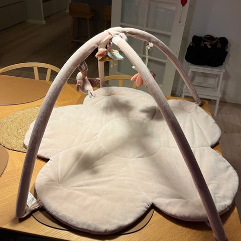 Super flot og stabilt stativ i træ, hvor man kan hænge det legetøj op man selv ønsker. Er der ikke “hængere” på legetøjet, bruger man blot en plastik ring til at montere legetøjet med. De kan købes i babyforretninger, og vi har en I kan få med. -Vi har aldrig haft brug for mere end én ring.