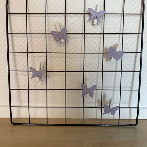 Fin lille opslagstavle i sort metalgitter med 6 små træklemmer med gule sommerfugle :)