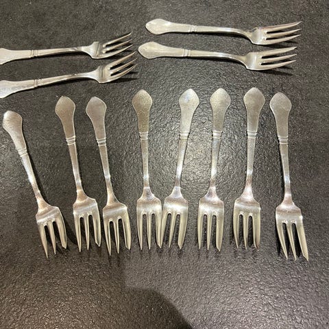 10 skønne pletsølv kagegafler i mønstret Harlekin. Pæn stand. 14 cm. Sælges samlet til 250,- kr.