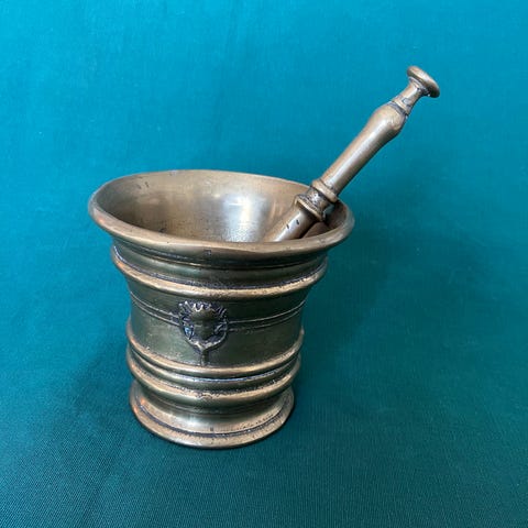 Messing morter med tilhørende støder ( pistil). Den er oprindelig fra et apotek. Den er ca 11 cm høj og pistillen er 17 cm lang. Morter og pistol vejer 1,15 kg.