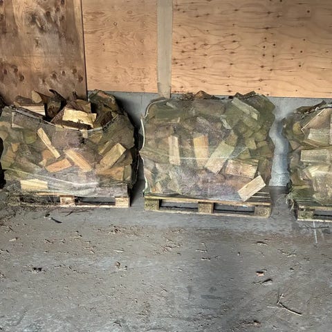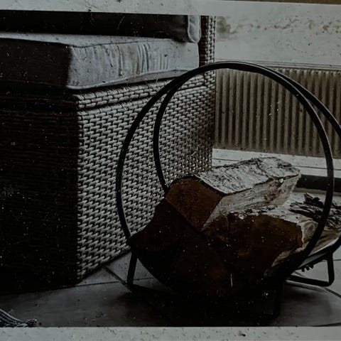 Stativ og ramme som brænden ligges ned i, og inden dette, har man trukket nætsækken over rammen, og så løfter man i rammen og hokus pokus, så har du lavet en sæk brænde.