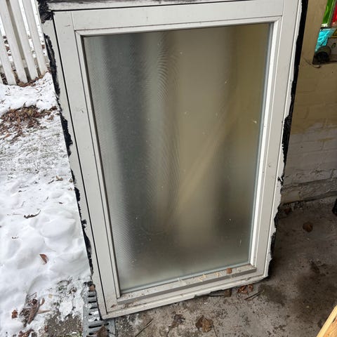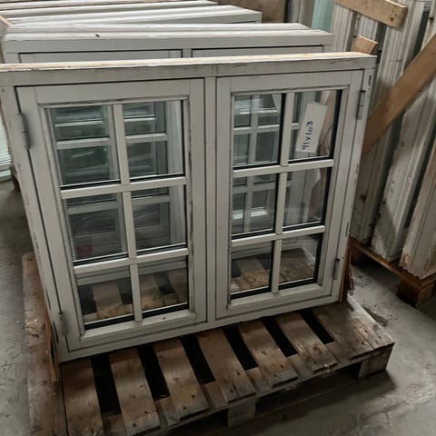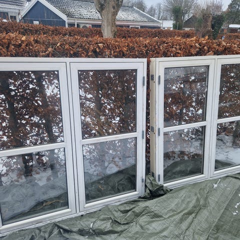 Vindue med sprosser i hvidmalet træ/ aluramme. Fire ruder med flere små glasfelter, opdelt af sprosser. Klassisk design.