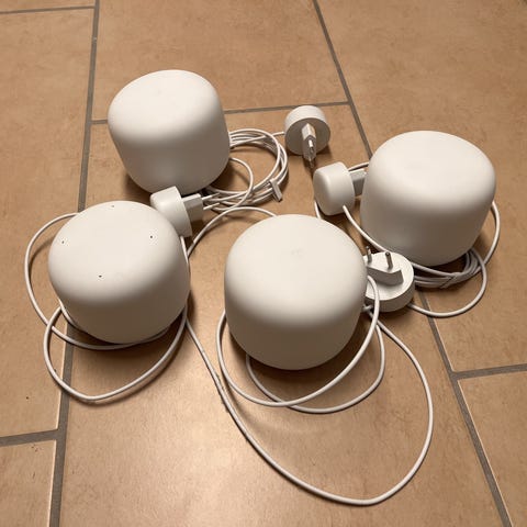 Google mesh Wifi Router er en trådløs router i hvid farve. Den er designet til at levere stabilt og hurtigt internet i hjemmet ved hjælp af mesh-netværksteknologi. Routeren har et kompakt og minimalistisk design, der passer til forskellige indretninger.