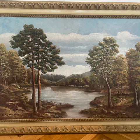 Maleri forestillende to fugle i sneen. Maleriet er indrammet i en gylden træramme. Motivets farver inkluderer blå, hvid og nuancer af brun og rød på fuglene.