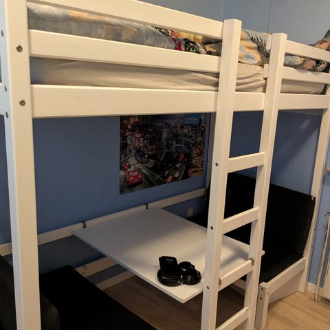 Hoppekids Eco Dream køjeseng, med siddeplads og bord som kan lægges ned, så det bliver en seng. 4 delt madras til nederste seng medfølger. Den trænger til at blive frisket op med lidt maling og der er knækket en enkelt lamel under det ene sæde. Sengen er af en god kvalitet og kan holde mange år endnu.