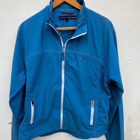 Tommy Hilfiger Tommy Jeans jakke i størrelse L til mænd. Jakken har multifarvet design med blå, rød, hvid og gule detaljer. Materialet er let og velegnet til udendørs brug.