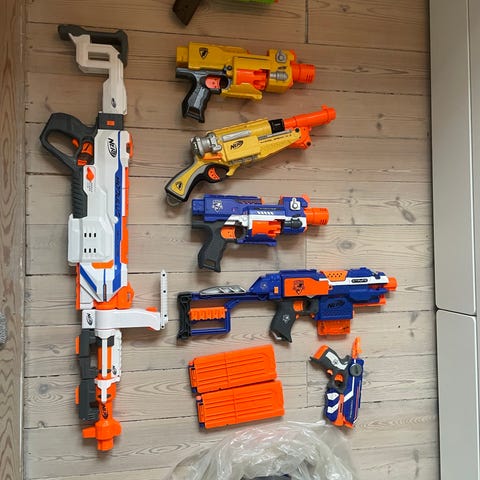 1 Nerf og 3 X-shot geværer med tilbehør sælges som på billeder.