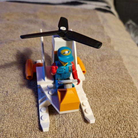 LEGO City Helikopter med to rotorer. legetøj i blå, sort og orange farver. Sættet inkluderer en helikopter med roterende propeller, cockpit, og landingsstel. Der medfølger mini figurer og et lille guldtillbehør. Passer til børn og samlere, som ønsker at bygge og lege med bytema.