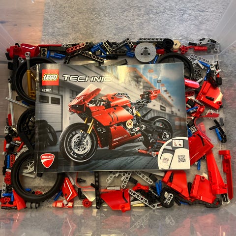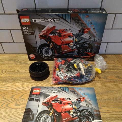 LEGO Technic Ducati Panigale V4 Motorcykel Model i rød farve. Modellen er en detaljeret gengivelse af Ducati Panigale V4 motorcyklen med bevægelige dele og realistiske funktioner. Sættet indeholder byggevejledning og er designet til at give en teknisk udfordrende byggeoplevelse.