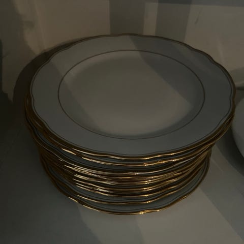 8 dybe tallerkener i porcelæn med hvidt design og guldkant.