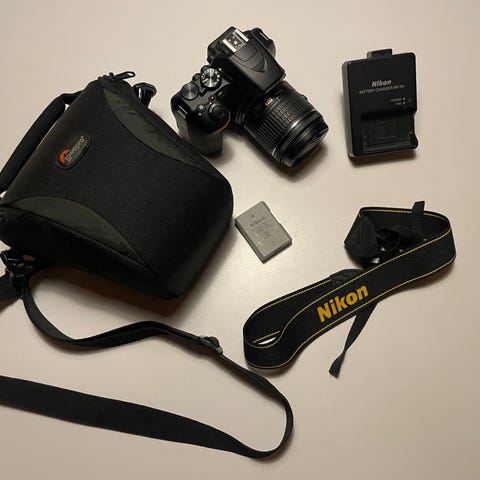 Nikon D3400 Digital SLR Kamera med et AF-S DX Nikkor 55-200 1.4-5.6 VR zoomobjektiv i god stand. 128GB SD kort og ekstra batteri medfølger
