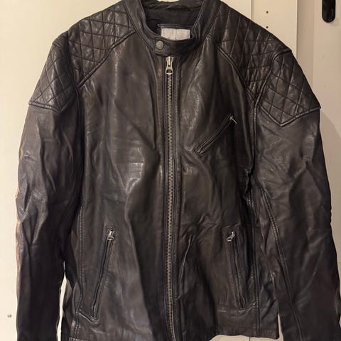 Super jakke fra Pepe Jeans i faktisk ubrugt (kun brugt to gange) og fra ikke ryger så er som ny. Er i sort lammeskind og med en anelse skrå lynlås i lidt biker look og med kinakrave. Kom og se og prøv, kan også sendes og da jeg ikke anvender den sælges den for så lidt som