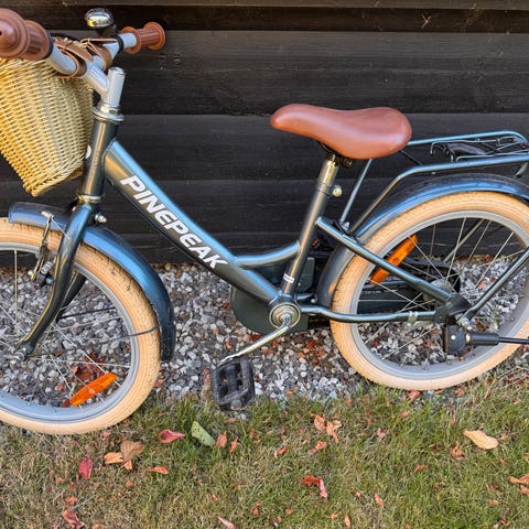 Flot kildemose pigecykl 18” med lav indstigning 30cm stelhøjde, bagagebærer, støttefod, håndbremse på forhjul, bag bremse i pedaler, gode dæk, kører meget let