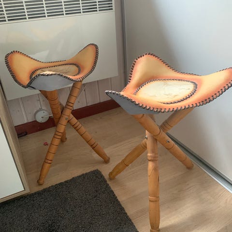 Slidt i den blanke lak, men stadig flotte på den blå siddeflade. Taburetterne kan stables. Prisen er for dem begge.