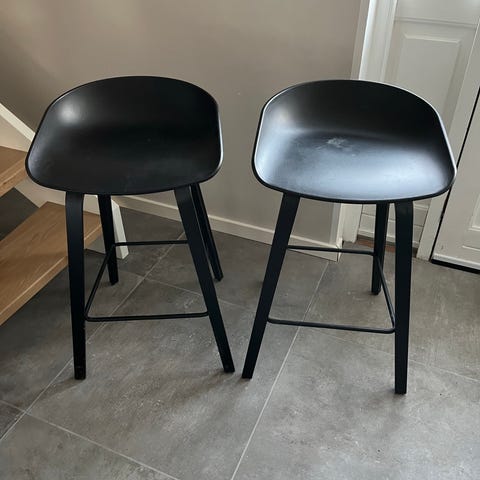 2 flotte HAY barstole sælges, med grønt sæde og sorte ben.
