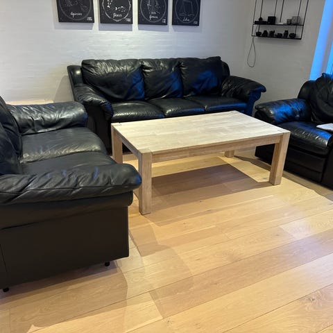 Særdeles fint sofagruppe med 2 + 3 sofaer og et bord. 3 sofa er som ny, men 2 sofa er lidt nedsat hvor den har været brugt. Sofabordet har en lille skade fordi der er spildt noget vand tidligere. Men ellers ikke tildeles flot sofa