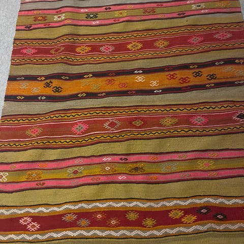Håndvævet Kelim tæppe i patchwork i smukke nuancer. Er brugt en enkelt gang som vægtæppe på udstilling.