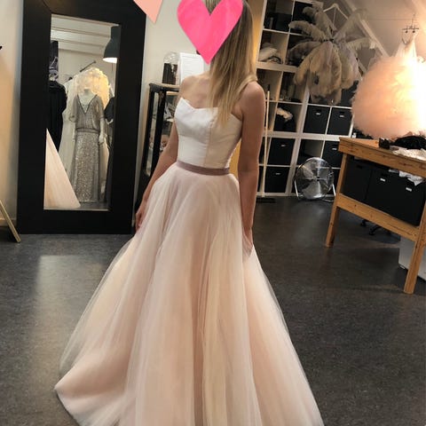 Kjolen har et feminint havfrue-snit med smukt fald i chiffon og et elegant topstykke i morocain. Den har pufærmer, åben ryg og et fint slæb, som giver et både romantisk og moderne udtryk. Lukkes med lynlås bagpå.