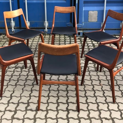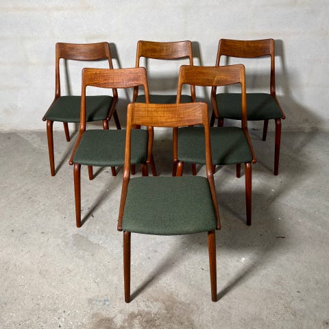 6 stk ikoniske og smukke Boomerang stole, i massiv teaktræ, tegnet af Alfred Christensen.