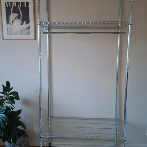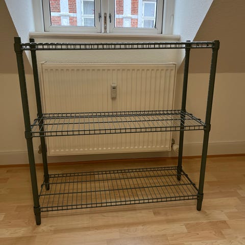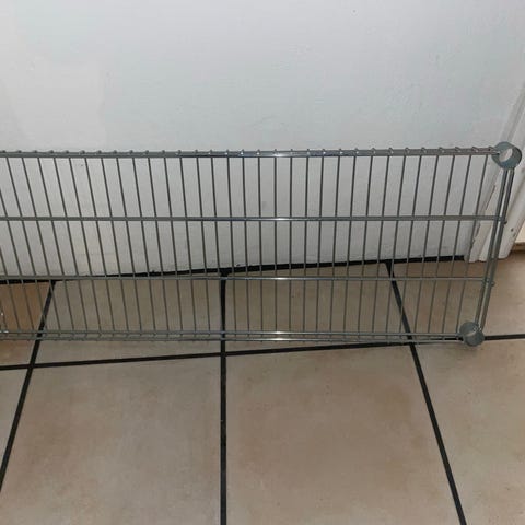 Har 1 trådhylde (36x92 cm) til 40 kr. Der medfølger plastklemmer.