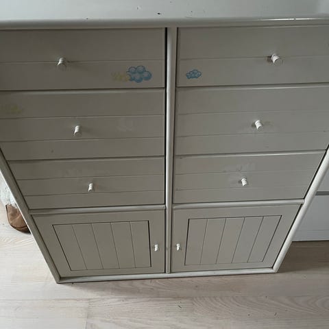 Vi sælger denne kommode fra Leander som vi har brugt som puslekommode. Den mangler et greb, men man kan tilkøbe nye greb enten i filt eller læder for 100/150 kr på Leanders hjemmeside ☺️ kommoden er i god funktionel stand, men har synlige brugsspor i skufferne (se billeder)