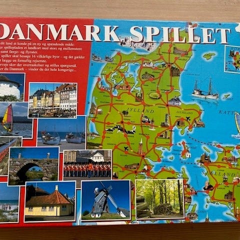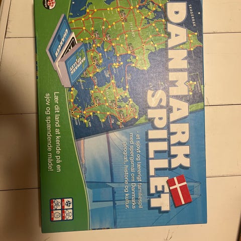 Danmark Spillet brætspil med Danmark kort, indeholder spillebrikker, terning og spørgsmålskort. Spillet er designet til flere spillere og fokuserer på geografiske og kulturelle aspekter af Danmark.