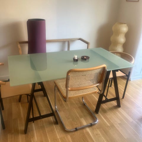 Mælkehvidt glasbord fra IKEA model Galant. N E D S A T