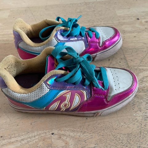 Rulleskøjte skoen har hjul som kan tages op under skoen så de kan bruges som rulleskøjter eller som sko. Har LED lys som kan lades op