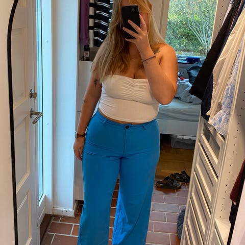 Bukserne måler 66 cm i taljen og skridtmål 78 cm.