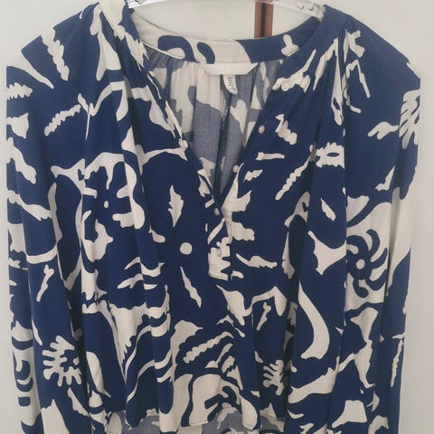 H&M Bluse i størrelse M med blå og hvide mønstre. Kan sendes på købers regning eller hentes på min adresse i Vodskov.