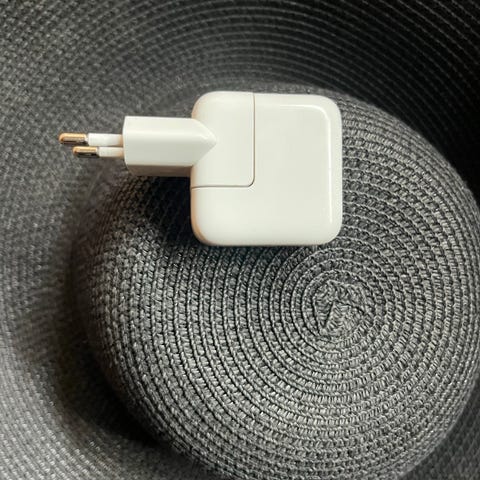 Apple Oplader i hvid farve med USB-port. Designet til opladning af kompatible Apple-enheder. Kompakt og bærbar model med foldbar stikprop.