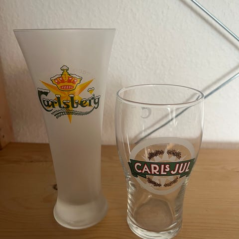 6 Carlsberg ølglas, hvorpå der står Glædelig Jul. Det er ikke så tydeligt på billederne, men nemt at se i virkeligheden.