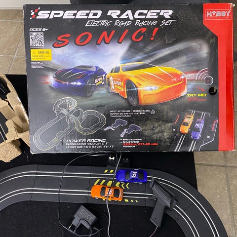 Sonic Speed Racer elektrisk racersæt til børn. Sættet indeholder et racerspor med loops og to håndholdte fjernbetjeninger. Designet til elektrisk drift med tilhørende strømadapter og samlevejledning. Få skader på veje, som vist på sidste billede, men fuldt funktionelt.